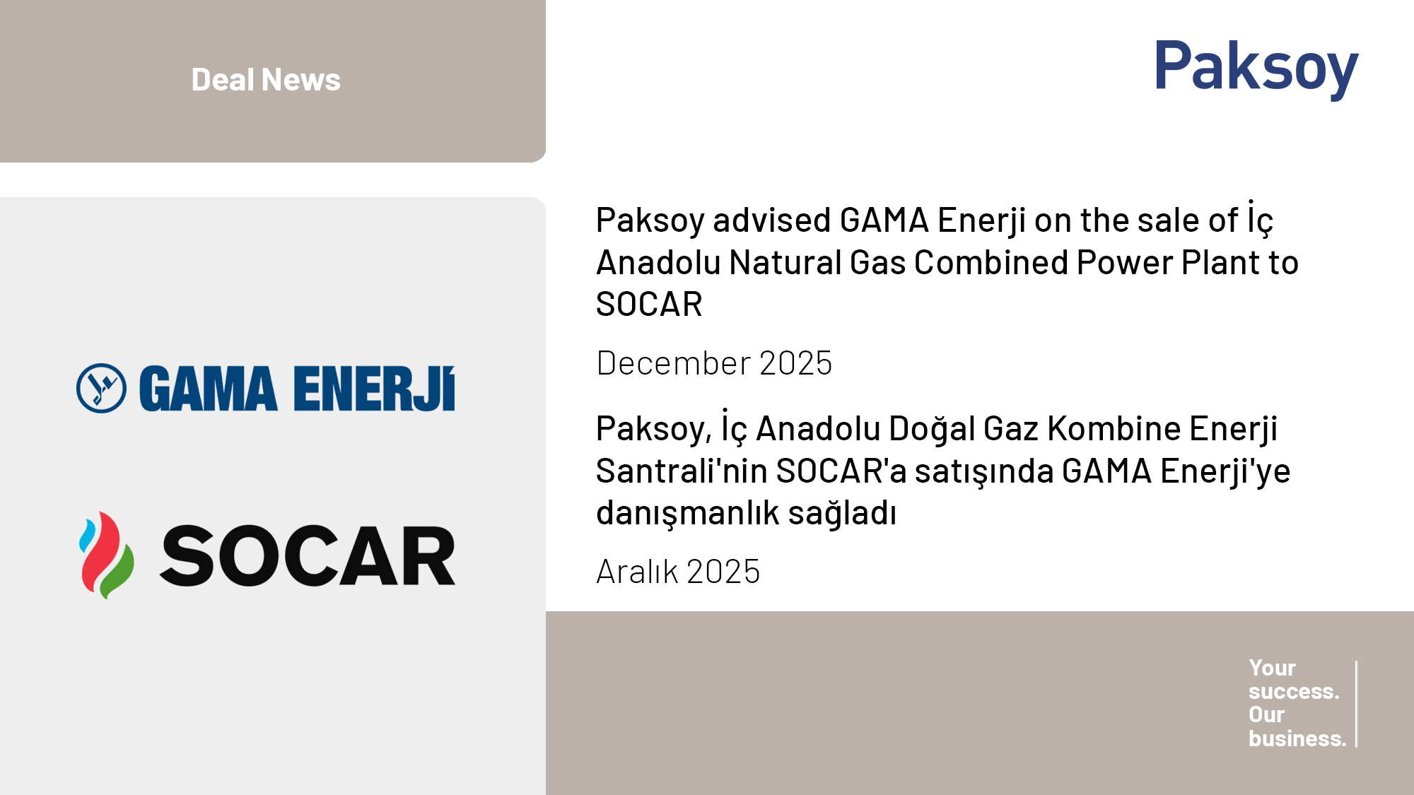 Paksoy, İç Anadolu Doğal Gaz Kombine Enerji Santrali'nin SOCAR'a satışında GAMA Enerji'ye danışmanlık sağladı.