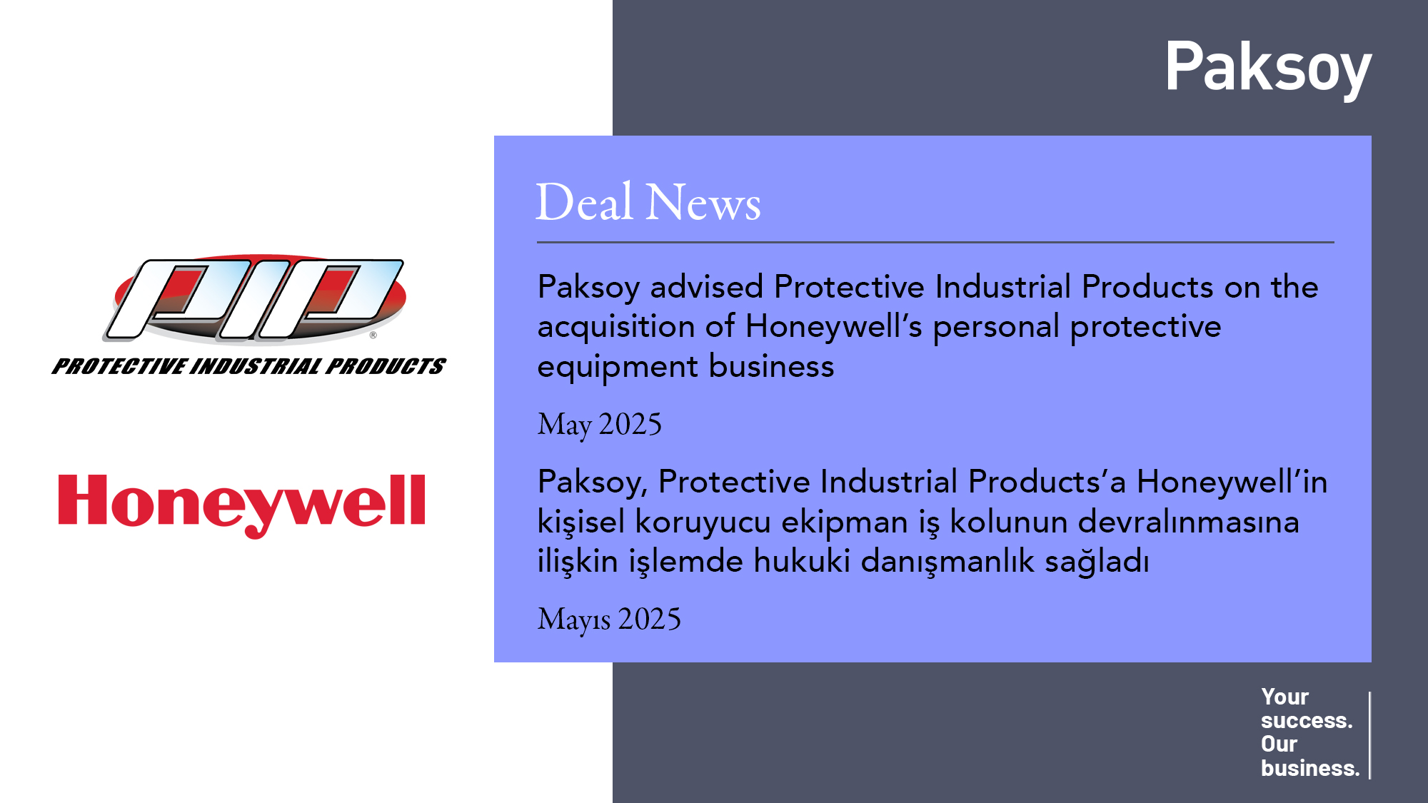 Paksoy, Protective Industrial Products’a Honeywell’in kişisel koruyucu ekipman iş kolunun devralınmasına ilişkin işlemde hukuki danışmanlık…